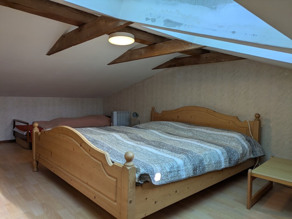Podkrovní pokojík skrývá pohodlné přespání na 3 postelích. V pokoji jsou elektrická kamna a vestavné skřínky.